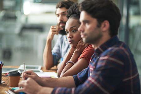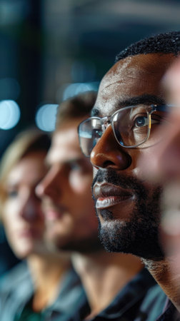 A group of focused individuals listen intently in a meeting. Diverse teamwork and collaboration in a modern workplace are depicted.