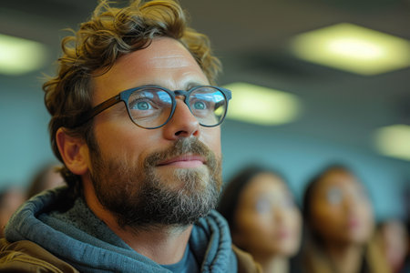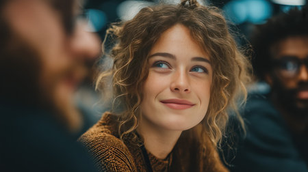 Portrait of a young woman attentively participating in a group wellness or mindfulness session indoors. Concept of concentration, self awareness, and mental clarity.