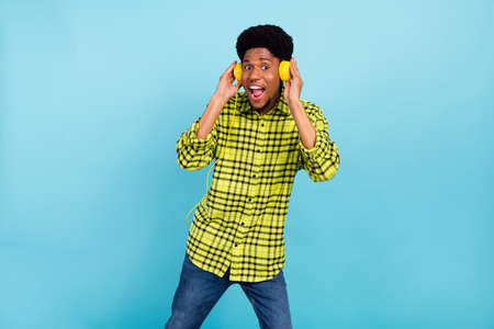 Photo of young brunette hooray guy listen music wear yellow shirt headphones isolated on blue color background