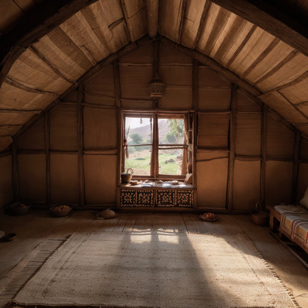 Wooden beams create a cozy atmosphere in a rustic cabin setting with vibrant colors