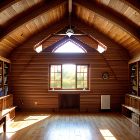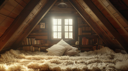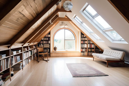 large attic room with sloping ceiling, windows, and built-in bookshelves, created with generative ai