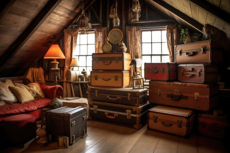 antique trunks arranged in a cozy attic space, created with generative ai