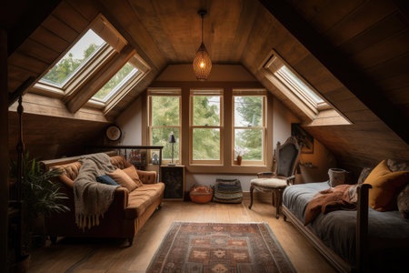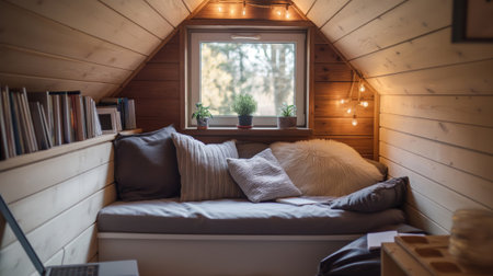 large attic room with comfortable reading nook, plush seating and natural light, created with generative ai