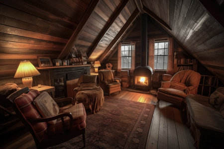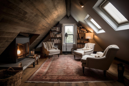 large attic room with cozy reading nook, plush armchairs, and fireplace, created with generative ai