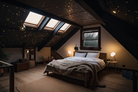 large attic room with view of the night sky, twinkling stars visible through the window, created with generative ai