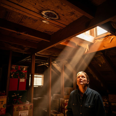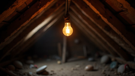 Eerie attic scene with glowing light bulb shadows and dust