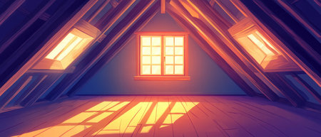 Bright and inviting cartoon illustration of an empty attic with vibrant colors and shadows