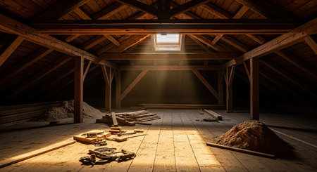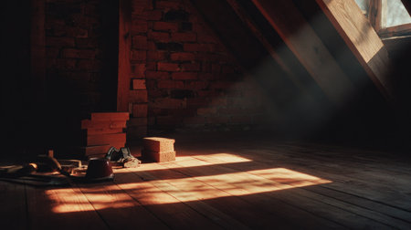 Dimly lit attic space, filled with the warm glow of sunlight streaming in through a skylight. Construction materials and tools are scattered on the wooden floor, casting long shadows. The brick walls and wooden beams contribute to the overall rustic atmosphere.
