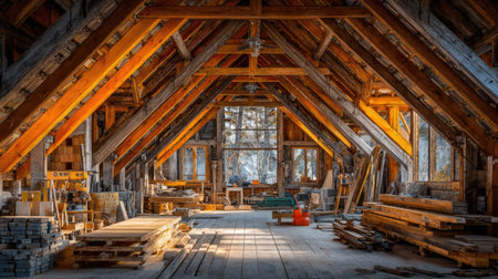 attic framework shows an interior filled with beams and tools, suggesting an ongoing renovation project in the space with the natural wood and light.