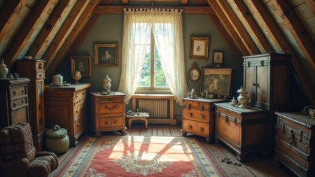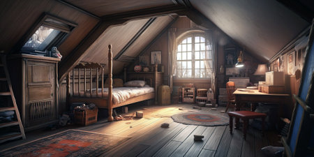 Cozy vintage attic room with wooden furniture and sunlit window. That the image is generated using AI.