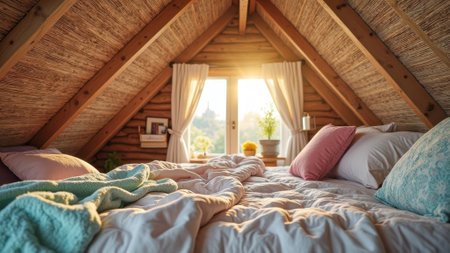 Cozy bedroom in rustic attic with wooden beams and sunlit atmosphere. That the image is generated using AI.