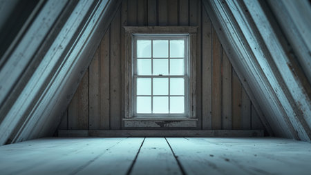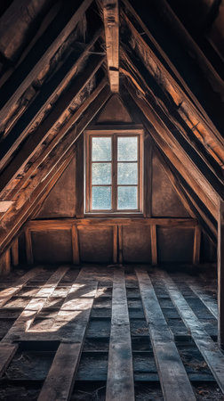 Empty rustic attic with wooden beams and window, moody ambiance. Abandoned home concept