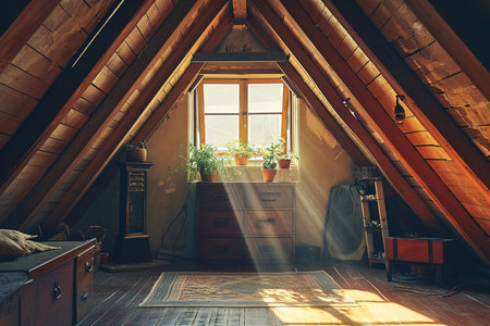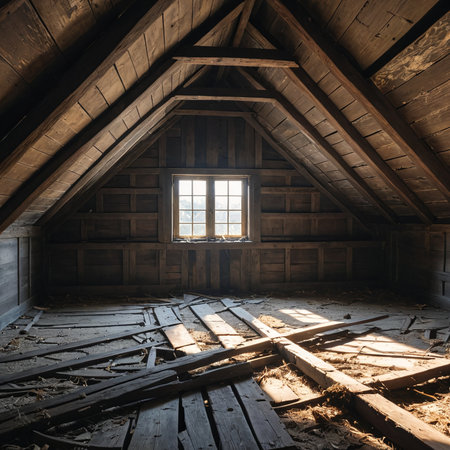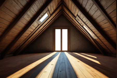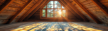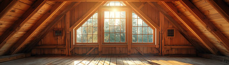 Sunlit, empty rustic wooden attic with windows