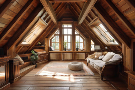 AI Generated. Rustic wooden attic with exposed beams and skylight windows