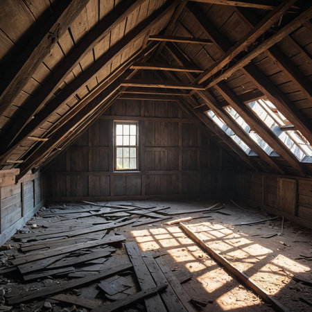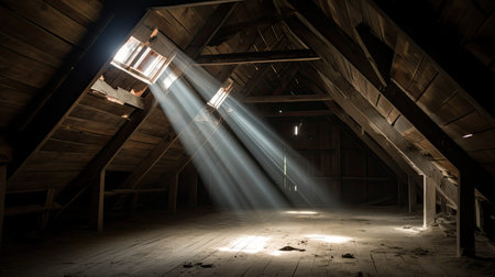 A rustic and unfinished attic interior showcases exposed wooden structural elements and floorboards, dramatically lit by a strong beam of sunlight from a roof window highlighting dust and scattered building materials, suggesting renovation potential and home improvement.