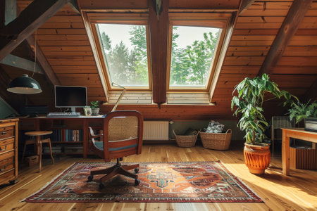 Working desk with natural light on the attic. In the style of hygge.