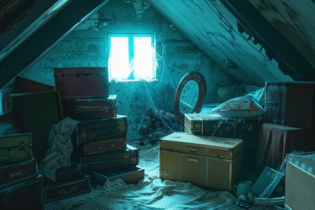 abandoned attic filled with items and cobwebs
