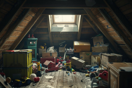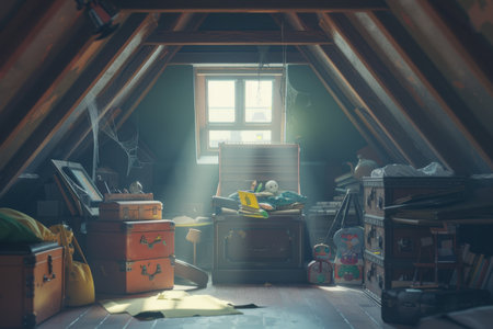 A cluttered attic with many old wooden boxes and trunks. The attic is filled with various items, including a bird figurine and a toy car. The scene gives off a sense of nostalgia