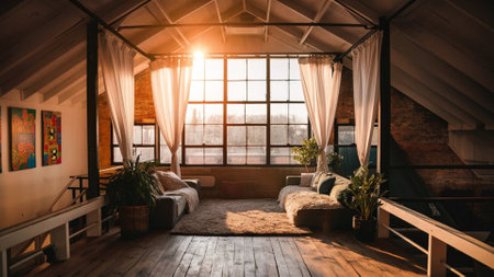 The interior of the room is loft-style. A room lit by light from a window. AI generated.