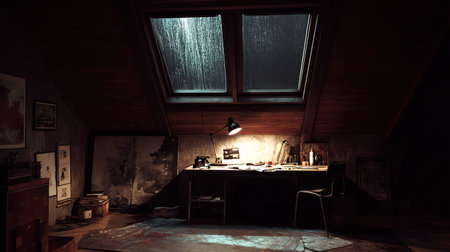 Atmospheric attic studio on a rainy night, illuminated by a desk lamp.