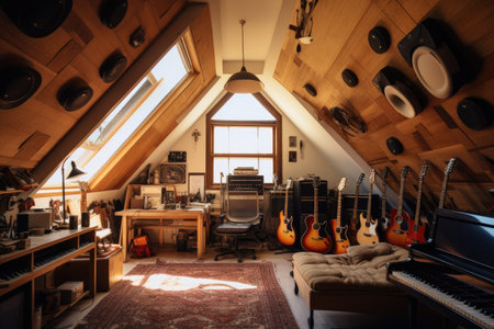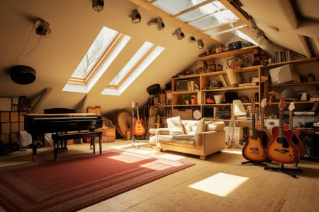 An attic recording studio with a skylight and vintage accents --ar 3:2 --v 5.2 Job ID: cec5db54-cdf8-4511-89c9-b5a0b290b1b0