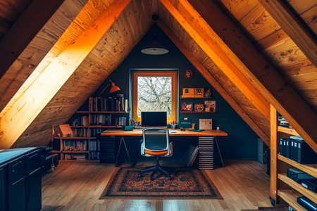 Warm sunlight filters through a window in a charming attic office.