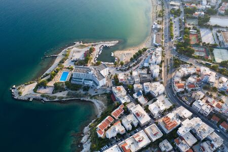 Athens Greece riviera coast, Asteras Vouliagmeni. Aerial drone view of the bay and peninsula, south coast. Cloudy blue sky, calm sea water