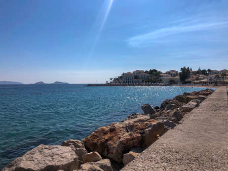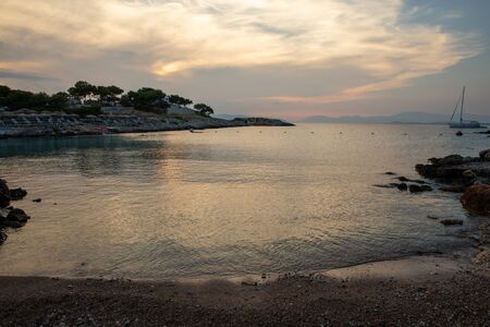 Summertime evening beautiful view from the beach of Aponissos, Agistri island, Saronic gulf, Greece. Horizontal.