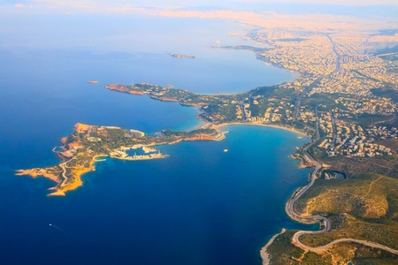 Aerial view of coastline of Athens, Greece shot from airplane