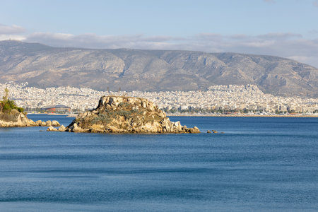 View from Votsalakia Beach of small Koumoundourou island in the Mediterranean Sea, Athens, Piraeus, Greece