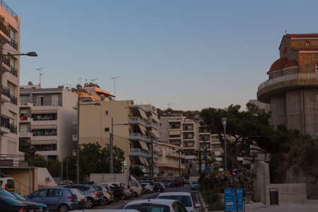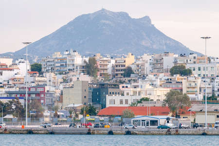 Panoramic view of Piraeus near Athens, Greece. Cityscape of Piraeus with colorful houses. Scenery of Greek city on hill in summer. Concept of travel and vacation in Greece.
