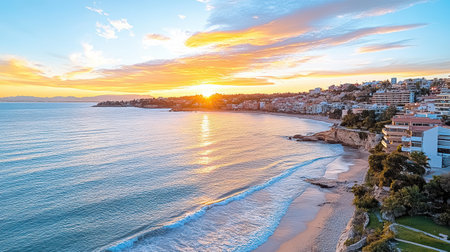 A stunning aerial view of coastal city at sunset, showcasing vibrant colors and serene waters