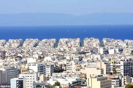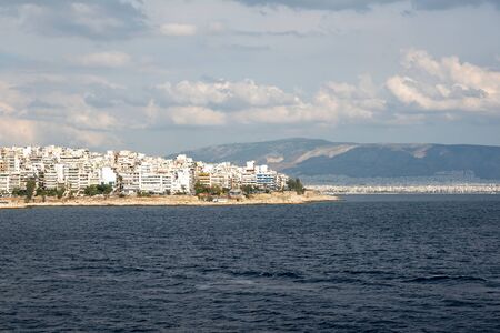 The city of Athens with white houses seen from the sea. Greek coast, Europe