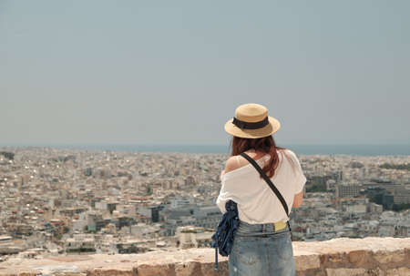 woman or girl with smart-phone taking photo at the city of Athens from Acropolis in a sunny day in Greece