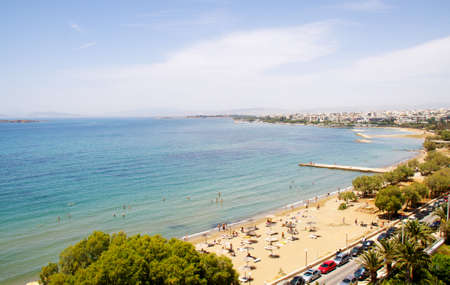 Aerial panorama of the beach at Vouliagmeni, south Riviera coast of Athens, Greece, with emerald, clear sea