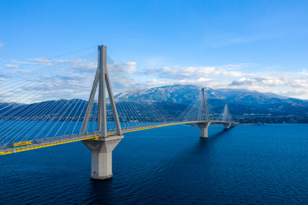 The Rion-Antirion Bridge near Patras in western Greece stretches across vivid blue water, with its striking suspension cables and pylons set against a backdrop of rugged mountains. Crisp daylight highlights the modern structure and the expansive Gulf of Corinth.