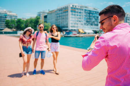 man or boy with smart-phone taking photo at the city of Athens from the Mount Lycabettus in a sunny day