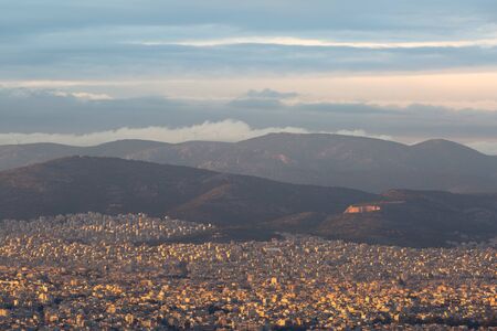 Athens skyline sunrise viewed from Mt Lykavitos with Acropolis, Greece.