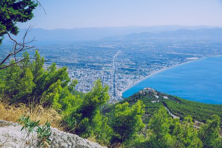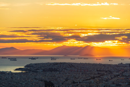 Panorama of Athens at sunset. Beautiful cityscape with seashore and distant islands visible under the red sunset sky. Travel photography.
