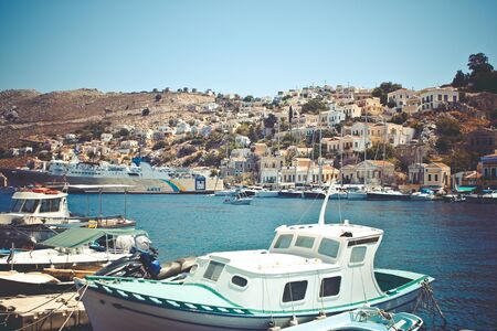 Greek island of Symi, Dodecanese, Greece - July 2019: Panoramic view of the coast the island of Symi