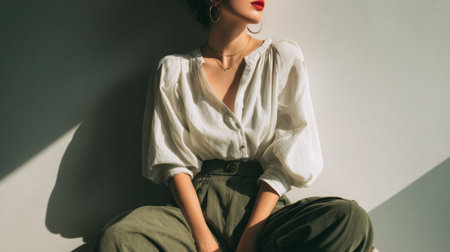 A woman sits still, wearing a white blouse and olive-green pants. Soft shadows fall around her as she poses against a light wall. She has a simple look with limited accessories.