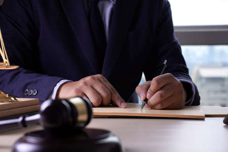 Law, lawyer attorney and justice concept, male lawyer or notary working on a documents and report of the important case in the law firm.