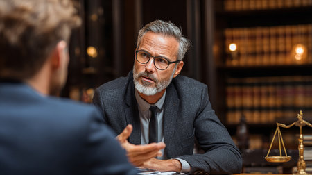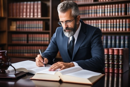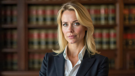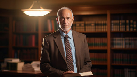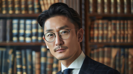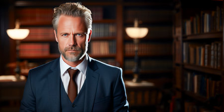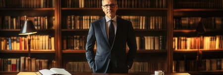 Professional lawyer in formal suit standing in law office with bookshelves, confident expression, legal consultant, experienced attorney, corporate advisor, expert in legal advice and consulting