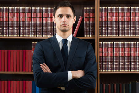 Close-up Of Male Lawyer With Arm Crossed Standing In Front Of Book Shelf