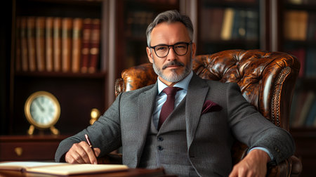 Businessman in a suit sitting in a luxurious leather chair in a classic office with bookshelves and a vintage clock