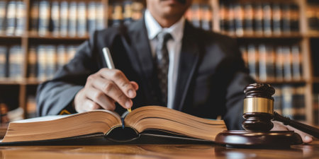 A judge's hammer and scales of justice and a jurisprudence book on a table in a lawyer's office. Provide legal advice to clients regarding business law. Law in everyday life.
