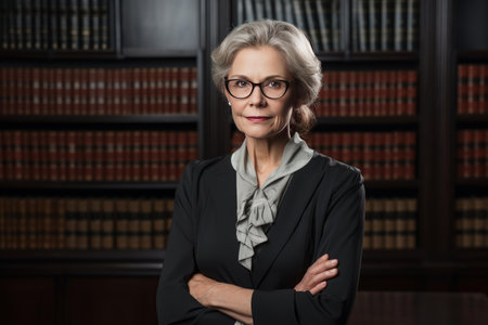 A confident 45-year-old female lawyer, standing with crossed arms in a courtroom, smiling warmly.