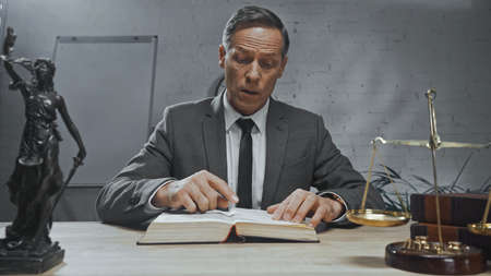 Insurance agent reading book near statuette of justice and scales on blurred foreground on table