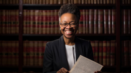 Lawyer Female African-American Mature Sitting behind desk reading documents in Law Firm. Generative AI AIG22.