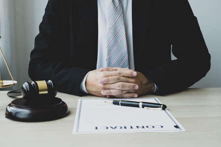 Professional man lawyers work at a law office There are scales, Scales of justice, judges gavel, and litigation documents. Concepts of law and justice.